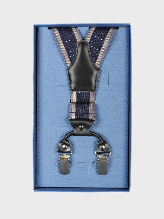 Eleganckie szelki w granatowym kolorze z subtelnymi białymi kropkami i paskami w odcieniach szarego, to doskonały wybór dla mężczyzn, którzy cenią klasyczny styl z odrobiną oryginalności. Stylowe połączenie granatu i szarego sprawia, że szelki pasują zarówno do formalnych, jak i bardziej casualowych zestawów.