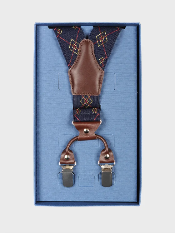 Unikalne granatowe szelki z geometrycznym wzorem w żywych kolorach to doskonały wybór dla mężczyzn, którzy lubią wyróżniać się oryginalnymi dodatkami. Kolorowy wzór dodaje szelkom nowoczesnego charakteru, czyniąc je idealnym uzupełnieniem zarówno eleganckich, jak i casualowych stylizacji.