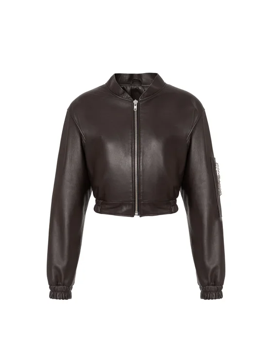 Skórzana kurtka typu bomber o oversize’owej linii wykonana z naturalnej skóry owczej w kolorze ciemnej czekolady.