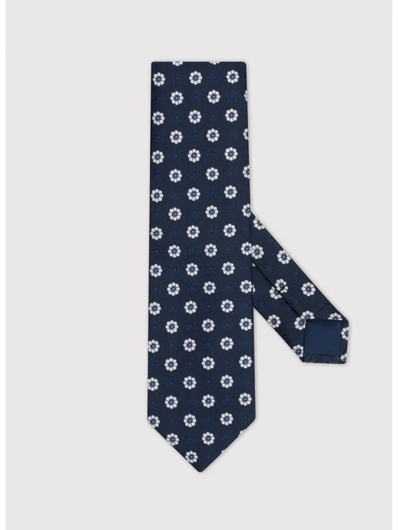 Krawat męski w kolorze granatowym z kolekcji Pako Lorente. Model w całości pokryty wzorem kwiatów w kolorze białym i granatowym. Granatowy krawat to klasyk, który można dopasować do różnych okoliczności i stylizacji. Krawat to doskonały pomysł na prezent, na święta czy urodziny.