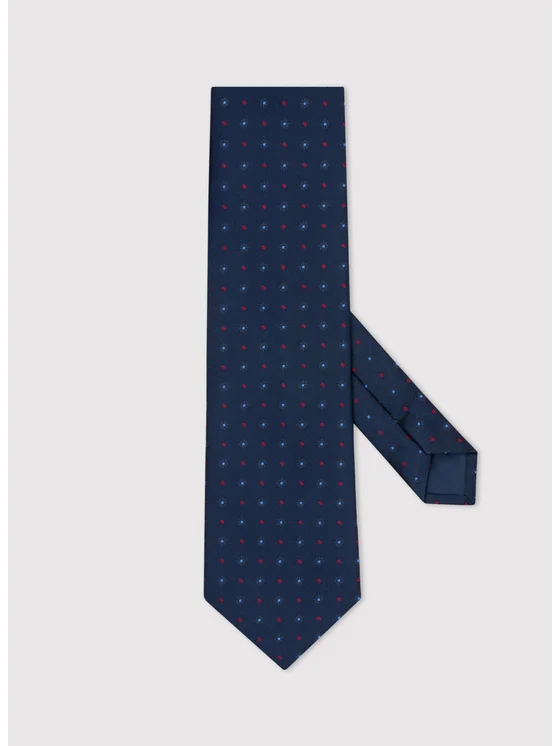 Granatowy krawat z kolekcji Pako Lorente. Model w całości pokryty mikrowzorem w kolorze czerwonym, granatowym i niebieskim. Granatowy krawat jest klasykiem, który nigdy nie wyjdzie z mody, dlatego będzie to świetny wybór do stylizacji eleganckich, jak i smart casual. Model w kolorze granatowym, doskonale będzie wyglądał w połączeniu z jasnym garniturem i białą koszulą.
