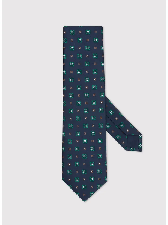 Krawat męski w kolorze granatowym z kolekcji Pako Lorente. Model w całości pokryty mikrowzorem w kolorze zielonym i pomarańczowym. Granatowy krawat to klasyk, który można dopasować do różnych okoliczności i stylizacji. Krawat to doskonały pomysł na prezent, na święta czy urodziny.