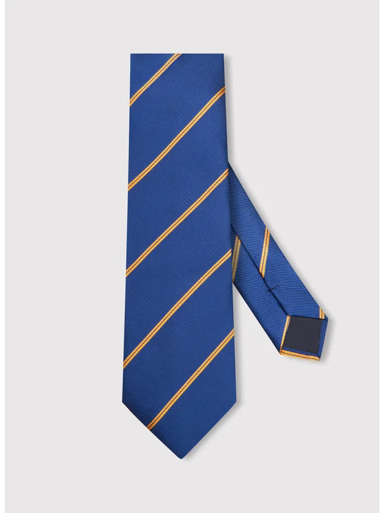 Granatowy krawat męski z kolekcji Pako Lorente. Wyjątkowy wzór skośnych, pomarańczowych pasków będzie idealnym urozmaiceniem formalnych, jak i smart casual stylizacji. Krawat dodaje wyrafinowanego stylu, a także podkreśla charakter całej stylizacji.
