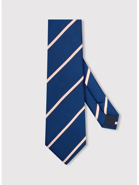 Granatowy krawat męski z kolekcji Pako Lorente. Wyjątkowy wzór skośnych, białych i pomarańczowych pasków będzie idealnym urozmaiceniem formalnych, jak i smart casual stylizacji. Materiał posiada widoczną fakturę. Krawat dodaje wyrafinowanego stylu, a także podkreśla charakter całej stylizacji.
