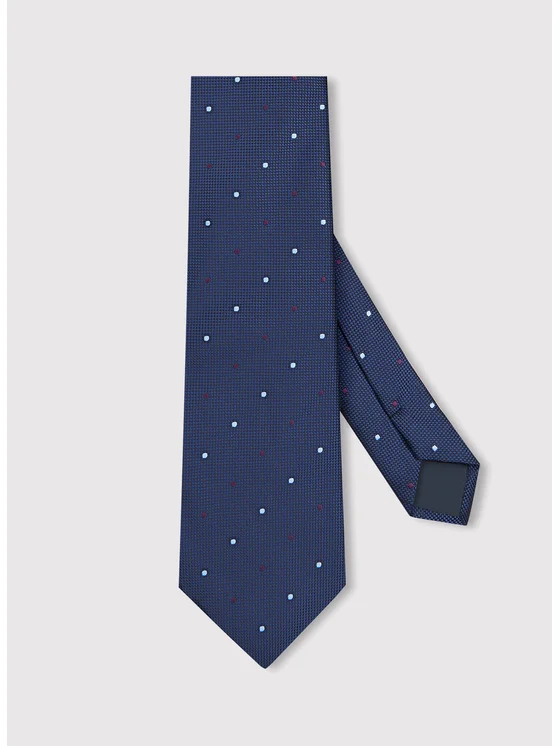 Męski krawat w kolorze granatowym w mikrowzór z kolekcji Pako Lorente. Krawat w całości pokryty drobnym wzorem kropek w kolorze niebieskim i bordowym. Krawat to idealny dodatek męskich stylizacji, który dodaje wdzięku i klasy. Model w kolorze granatowym, doskonale będzie wyglądał w połączeniu z jasnym garniturem i białą koszulą.