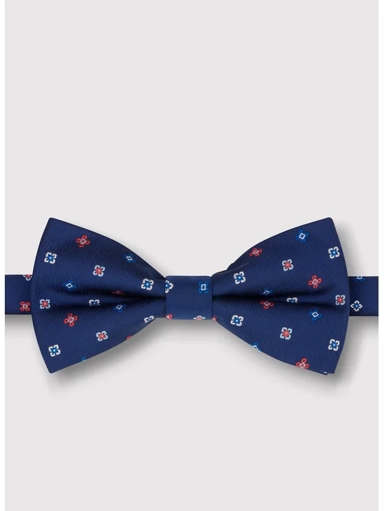 Męska mucha z kolekcji Pako Lorente. Model w kolorze granatowym zdobi mikrowzór w kolorze niebieskim, białym i czerwonym. Muszka zapinana jest na haczyk, który umożliwia regulację obwodu. Zapakowana w czarne pudełko muszka może być wyjątkowym prezentem dla każdego mężczyzny.