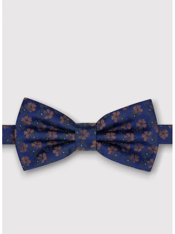Męska mucha z kolekcji Pako Lorente. Model w kolorze granatowym w brązowy wzór kwiatów. Muszka zapinana jest na haczyk, który umożliwia regulację obwodu. Zapakowana w czarne pudełko muszka może być wyjątkowym prezentem dla każdego mężczyzny.