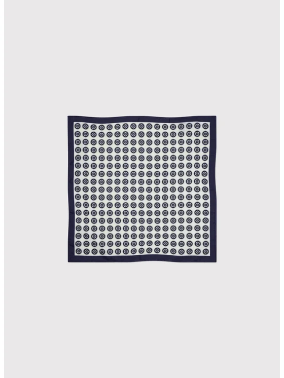 Granatowa poszetka męska od Pako Lorente. Poszetkę zdobi geometryczny, równo rozłożony granatowy wzór na białym tle. Poszetkę zdobi również wokół granatowa ramka. Wzorzysta chusteczka doskonale sprawdzi się do stylizacji eleganckich oraz do casualowych, co teraz staje się bardzo modne. Poszetka dodana do brustaszy zdecydowanie podkreśli Twój charakter oraz nada stylizacji wyrafinowanego stylu. Poszetka przyjmuje kształt kwadratu o boku długości 30 cm.