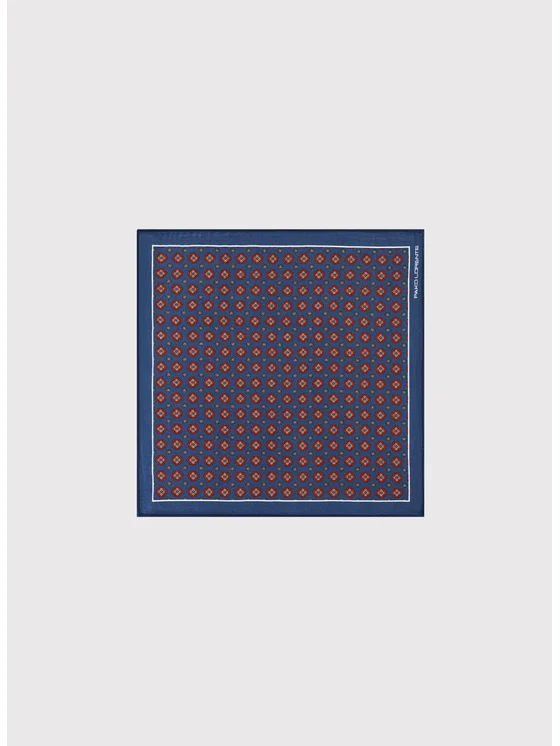 Granatowa poszetka męska z kolekcji Pako Lorente. Poszetka dodaje wyrafinowanego stylu, a także podkreśla charakter całej stylizacji. Poszetka w całości pokryta geometrycznym wzorem w kolorze czerwonym, pomarańczowym i niebieskim. Poszetkę zdobi również wokół biała ramka. Chusteczka w 100% wykonana z jedwabiu. Poszetka przyjmuje kształt kwadratu o boku długości 30 cm.