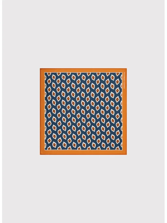 Poszetka w kolorze granatowym z pomarańczową ramką i wzorem. Poszetka z kolekcji Pako Lorente. Model z regularnym geometrycznym wzorem w kolorze beżowym. Poszetka wykonana w 100% z jedwabiu. Poszetka będzie idealnym dodatkiem do granatowego garnituru.