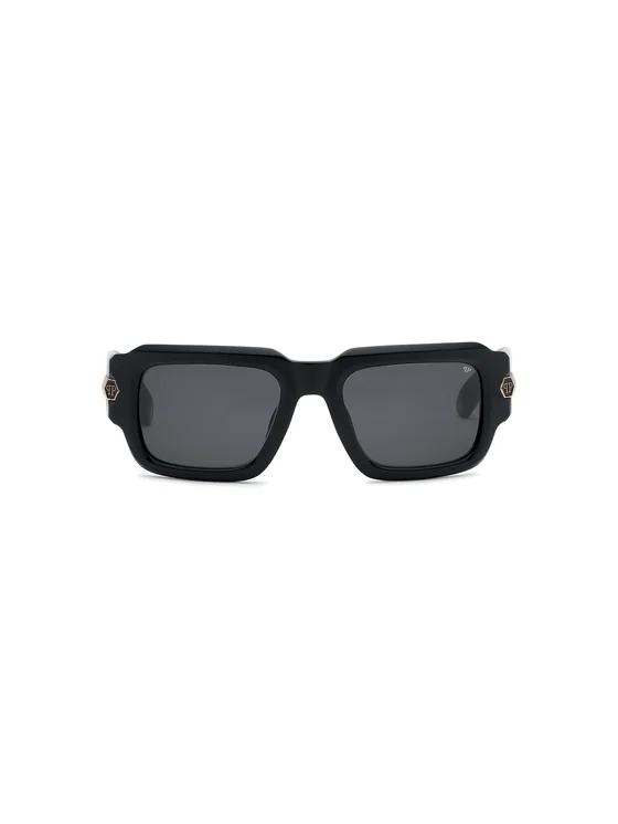 Wykonane z odważnego frezowanego octanu, te okulary przeciwsłoneczne łączą w sobie siłę i styl. Eleganckie zauszniki mają charakterystyczny napis Plein, a sześciokątne logo PP ukryte wewnątrz końcówek dodaje wyrafinowanego akcentu tożsamości marki.