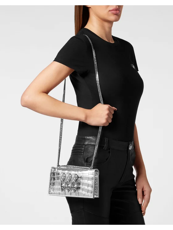 Agresywna i szykowna skórzana torba crossbody jest idealna na wieczorne wyjścia. Skóra z nadrukiem krokodyla Uchwyt w kształcie pajęczego pazura Regulowany pasek na łańcuszku Wewnętrzna kieszeń zapinana na zamek i lusterko Wewnętrzna podszewka Rozmiar: Mały